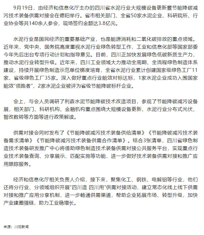 转发|这场四川水泥行业供需对接会 签约金额3.8亿元