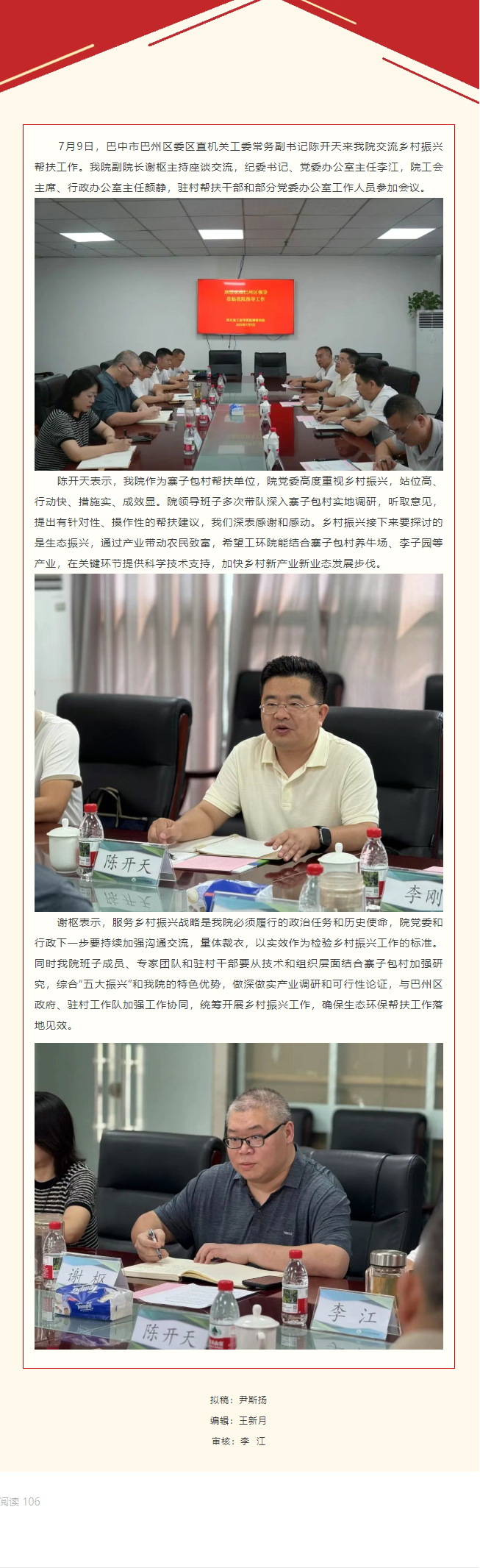 巴中市巴州区委区直机关工委常务副书记陈开天一行来我院交流乡村振兴帮扶工作