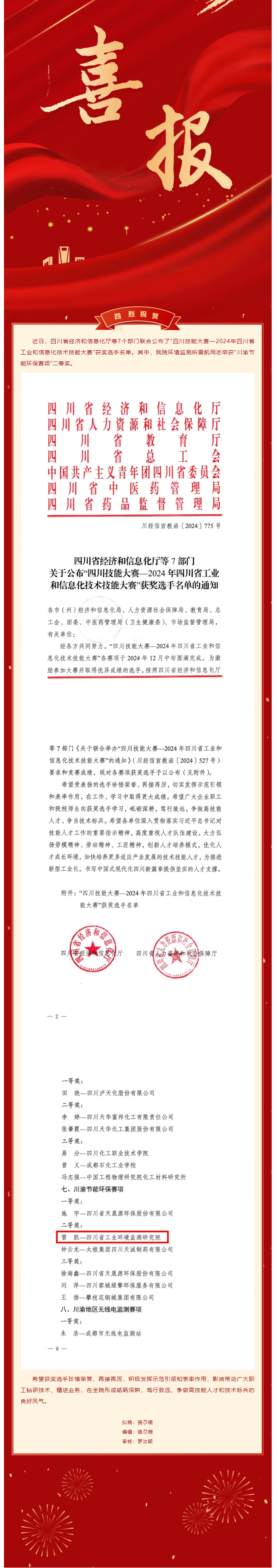 喜报|热烈祝贺我院雷凯同志荣获“四川技能大赛—2024年四川省工业和信息化技术技能大赛”川渝节能环保赛项二等奖
